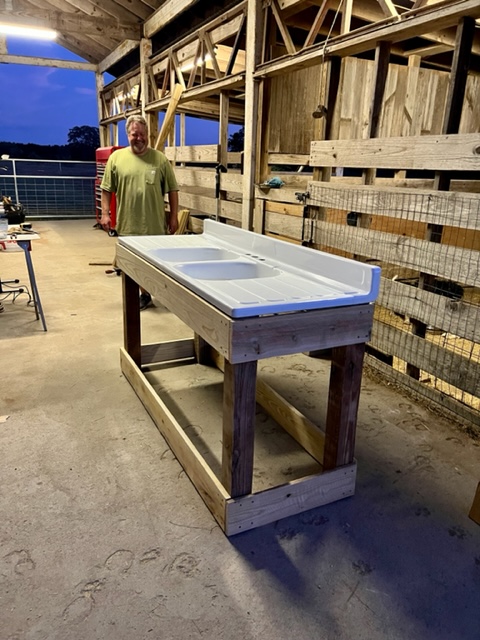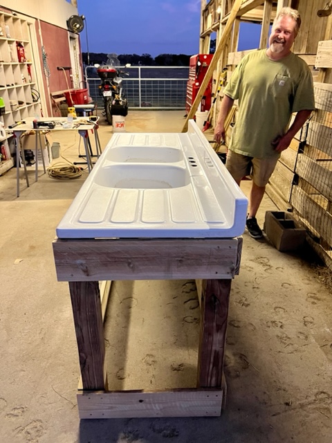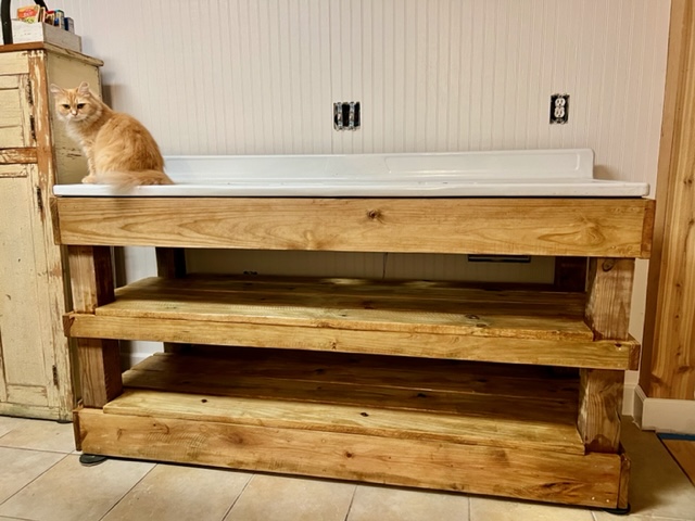 I hope our farm and kitchen projects inspire you to figure out some solutions for your own home. I wanted a double drainboard sink. I found one, but didn’t have a way to mount it to anything pre-existing, so we looked at pictures, made some adjustments, and went for it!! It is perfect for our needs, but not perfect aesthetically by any means. In fact, I’ll let you in on a secret. When the plumbers came to connect it to the drain pipes, we had to leave the moving sliders under it so that the plumbers could move it while they were cutting holes in the shelves. At the end, we totally forgot to remove the moving sliders and the sink cabinet is an exact fit to the drain pipes as is! We have to leave the moving sliders on it FOREVER so we are just going to tuck them directly under each post and it will always “hover” mysteriously above the floor. These are the kind of details that The Outdoorsman and I just don’t catch and have to laugh about afterwards. We need a super-detailed person to come visit us daily. Actually, we don’t need that at all because we are perfectly happy with our hovering sink cabinet. 😉