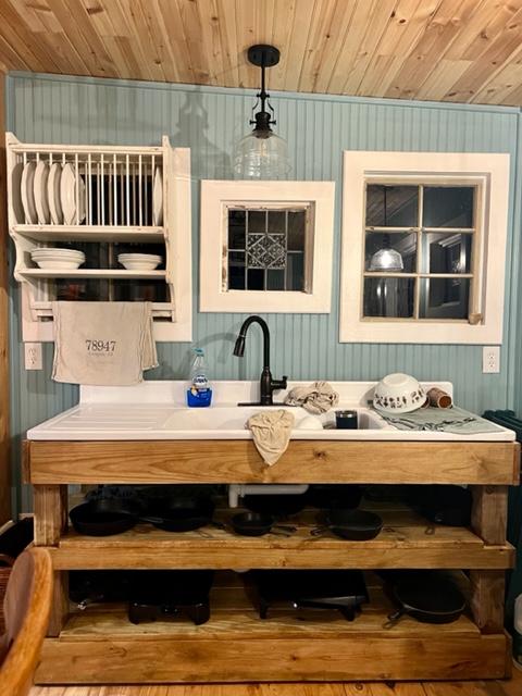 Anyhow, I absolutely love the sink cabinet! It is perfect in a not-so-perfect way. It is heavy, rustic, and whimsical. I did my very first job of staining on this piece and, to be honest, you can tell!! It is a bit splotchy, but I’m also blaming it on the fact it is treated wood. We thought it would be a good idea to use treated wood since it would probably get wet due to its function in the kitchen. I also had The Outdoorsman add a middle shelf so that I could store my heavy cast iron pots and pans on the shelves and really add to the possibility of it tipping our house over with the weight of it all!