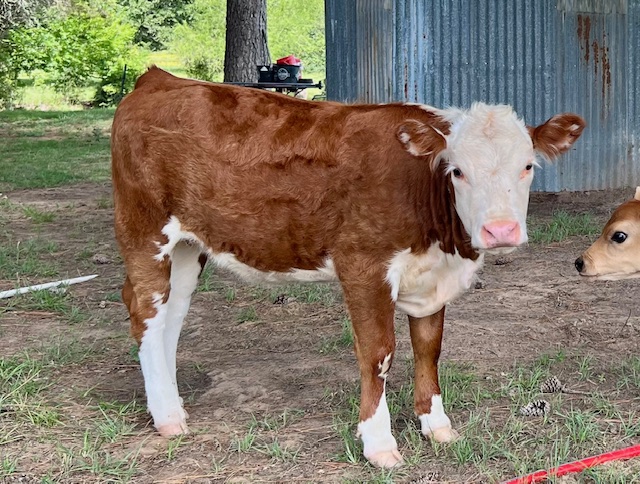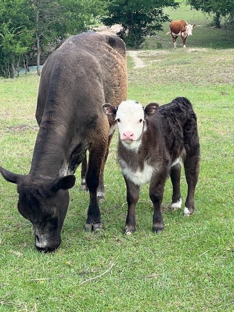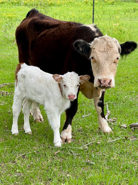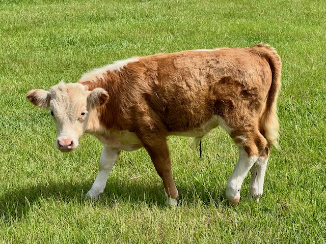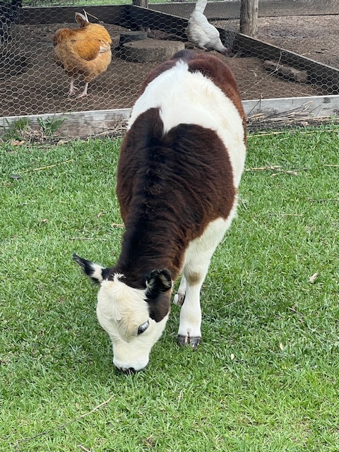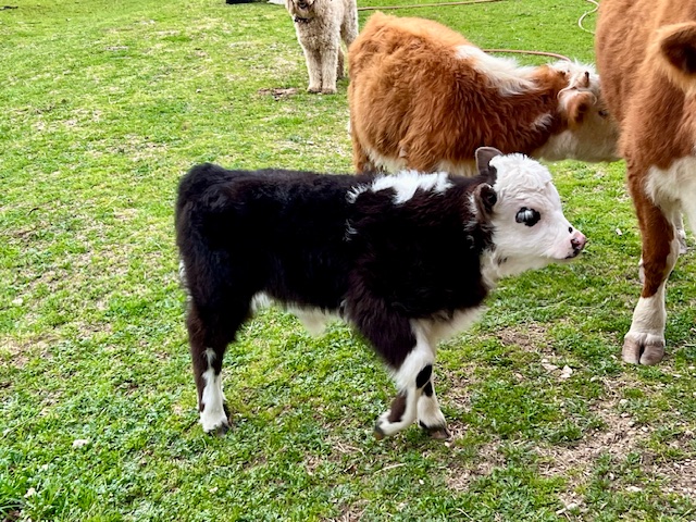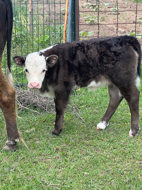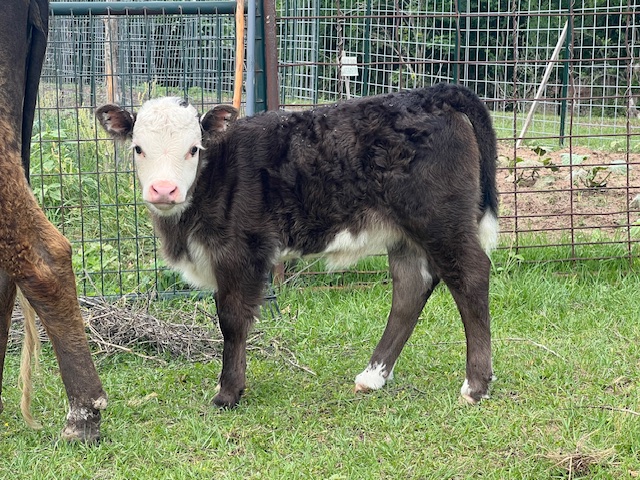 **UPDATE: Ginnie has grown into an absolutely beautiful heifer. We have decided to retain her at Green Acres after looking for other heifers for our farm.** Ginnie was born on 04/08/25 from our Hereford/Black Baldy Mix, Gussie, and our Micro-Miniature Panda bull, Teddie. Ginnie is a sweet and super curious cow like her mom, Gussie. She will follow you around to see what you are doing and then run off when you try to talk to her.