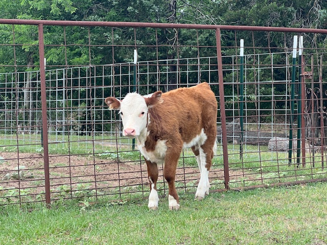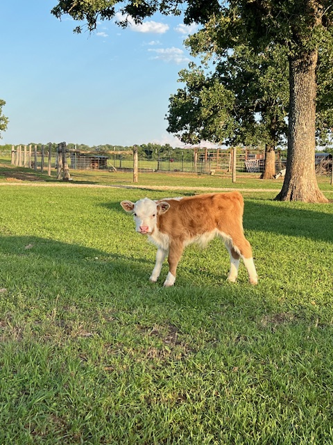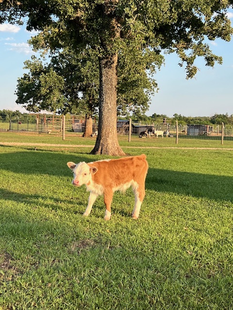 Below is our smallest Micro-Miniature bull calf, Tiny Tim. He was born on 03/07/25 and is the smallest calf we have ever had on Green Acres. His mom is our smallest Micro-Miniature Hereford and he is still smaller than our much younger calves. At eight months old, he is barely above our knees!! We are asking $5,000 for Tiny Tim and will, most likely, retain him to live permanently on Green Acres.