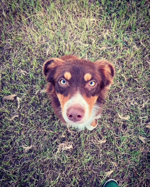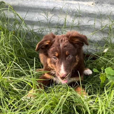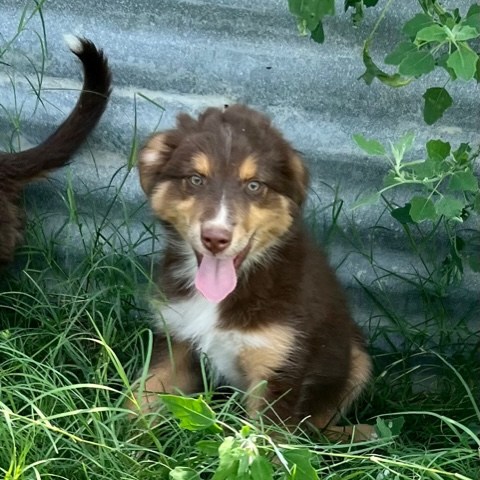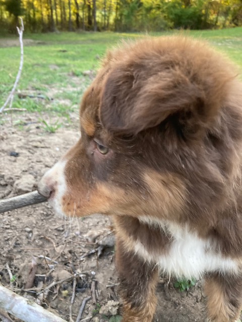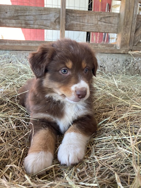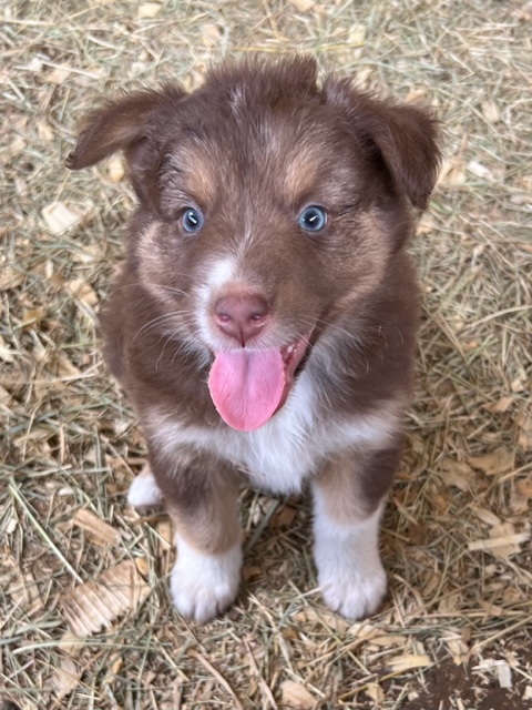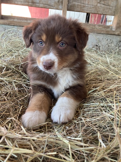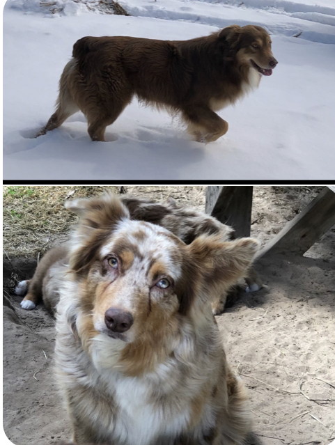 Ruby was born 01/15/21. She is a Red Tri-colored Australian Shepherd. Her mom is a Red Merle (grandparents were Red Tri-colored and Blue Merle) and here dad was a Red-tri with some white markings. (The last two pictures show her parents so you can see possible color combinations for her puppies!) Ruby has a very mischievous personality and likes to push boundaries a bit. We have to keep a close eye on her because she likes to explore and get into mischief with other animals. She is very sweet and smart and likes to help herd our cows and goats.