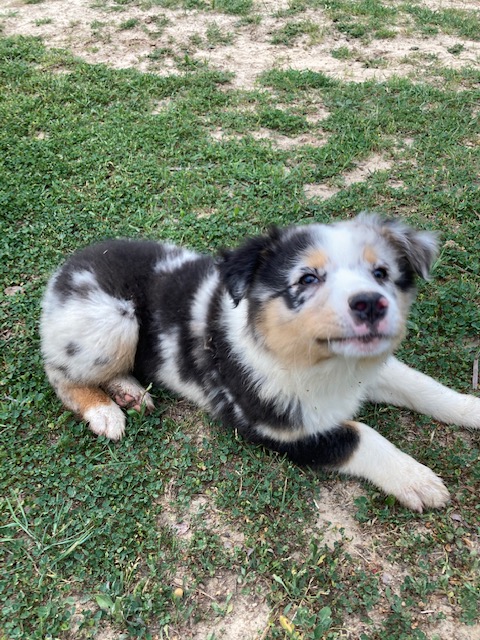 Opal was born on 01/17/21. She is a Blue Merle Australian Shepherd. Opal’s mom is a red tri-colored Australian Shepherd with lots of white markings and her dad is a Blue Merle Australian Shepherd. (The last two pictures show her parents so you can see possible color combinations for her puppies!) Opal is a very obedient dog who is a people pleaser. Whenever Ruby gets in trouble, she makes sure she stays close and lets us know she is being “the good dog”! Opal is really sweet and likes to give us hugs. She also likes to help herd our cows.
