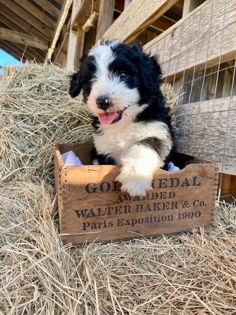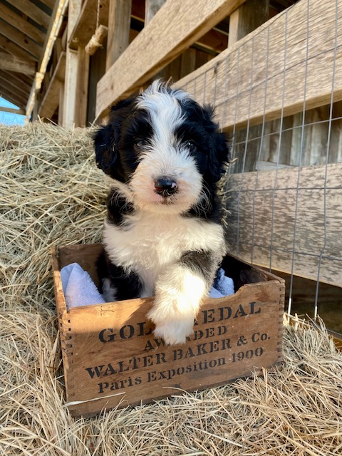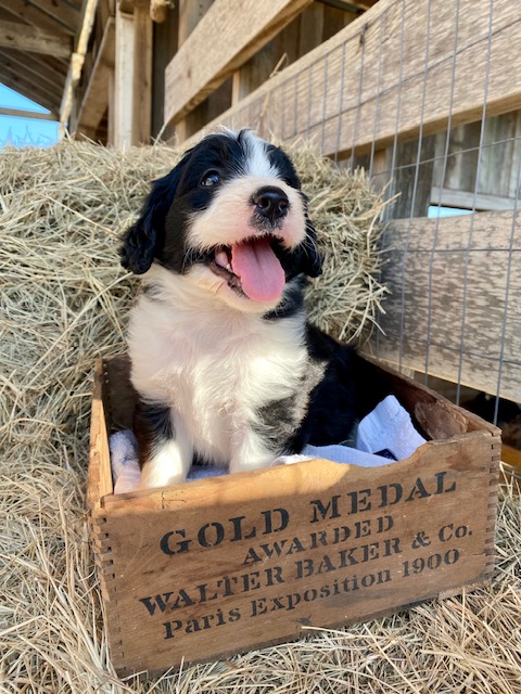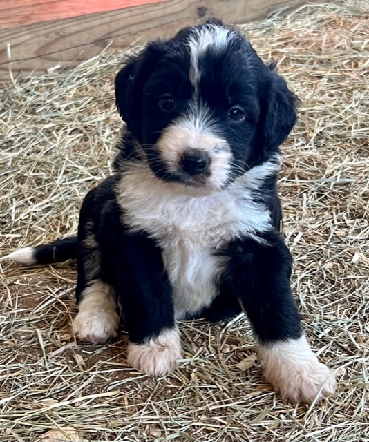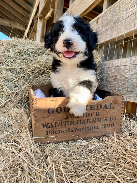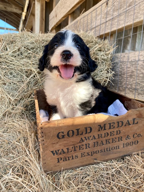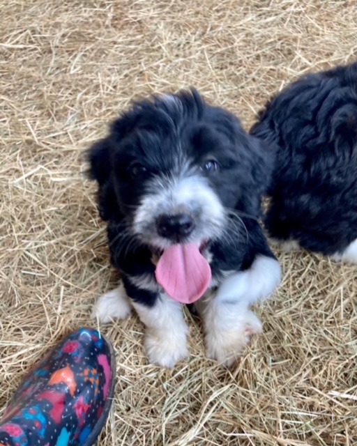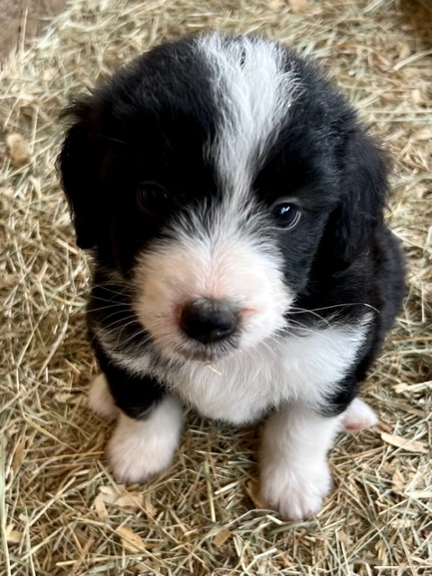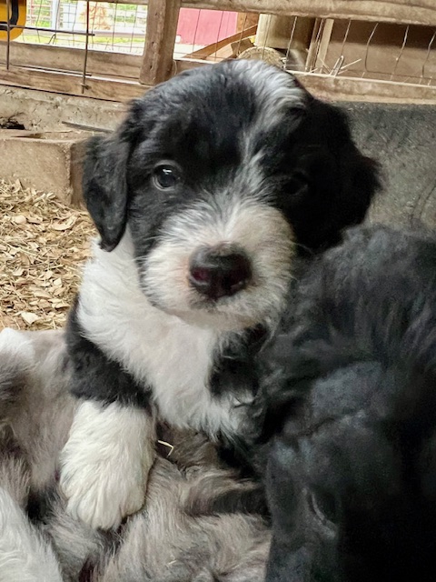 Our first litter of Green Acres Aussiedoodles was born on July 5, 2022 to our Australian Shepherd, Ruby, and our standard poodle, Jack. Ruby had seven active, healthy puppies. Four of them are black and white Tuxedo Aussiedoodles (2 males, 2 females), one brown and white (sable) Tuxedo Aussiedoodle, and two solid black girls with tiny tips of white.
