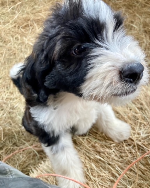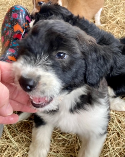 Green Acres Aussiedoodles is thrilled to announce our third litter of Aussiedoodles. Our red tri-colored Australian Shepherd, Ruby, and our Standard Poodle, Jack, had a beautiful litter of black and white Aussiedoodles on 03/16/23. Just for fun, our Australian Shepherd also, apparently, met up with our neighbor’s dog who is also a red tri-colored Australian Shepherd (thank goodness!), and they had three red-tri Australian Shepherd puppies at the same time!! (Yes, this is possible in dogs as I have VERY recently discovered. Our animals are driving me crazy because it doesn’t matter how much we work on our fencing, they can find a way around it!)