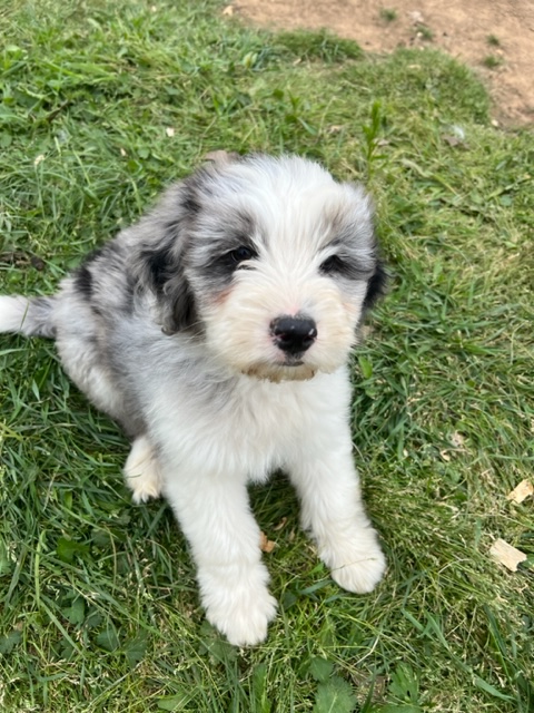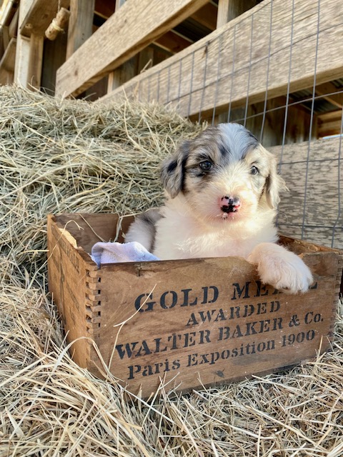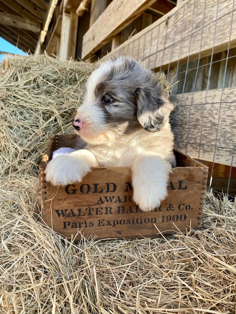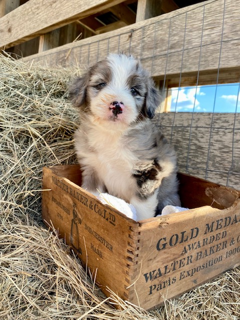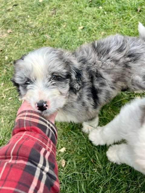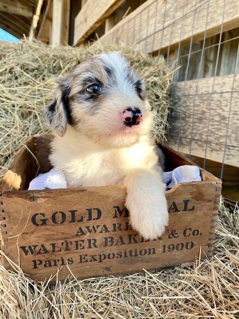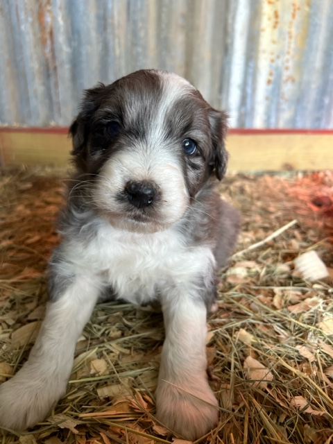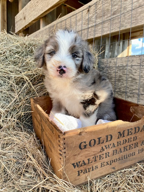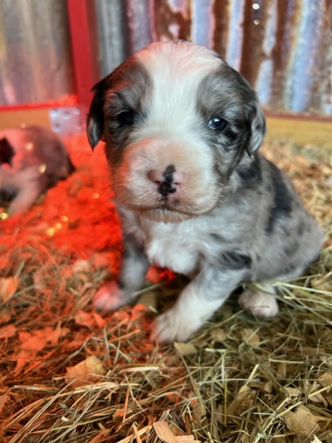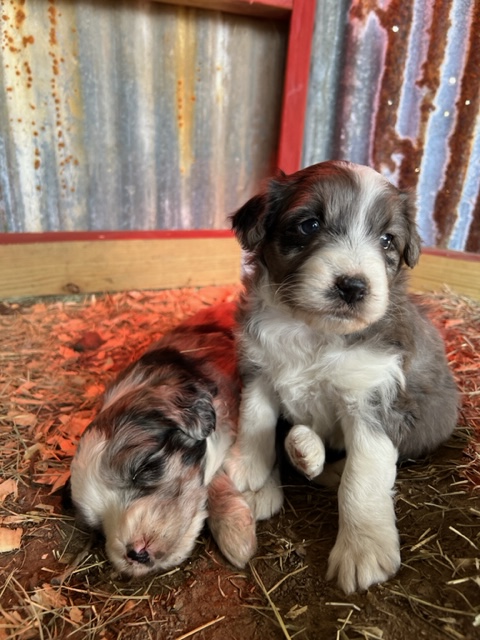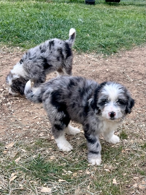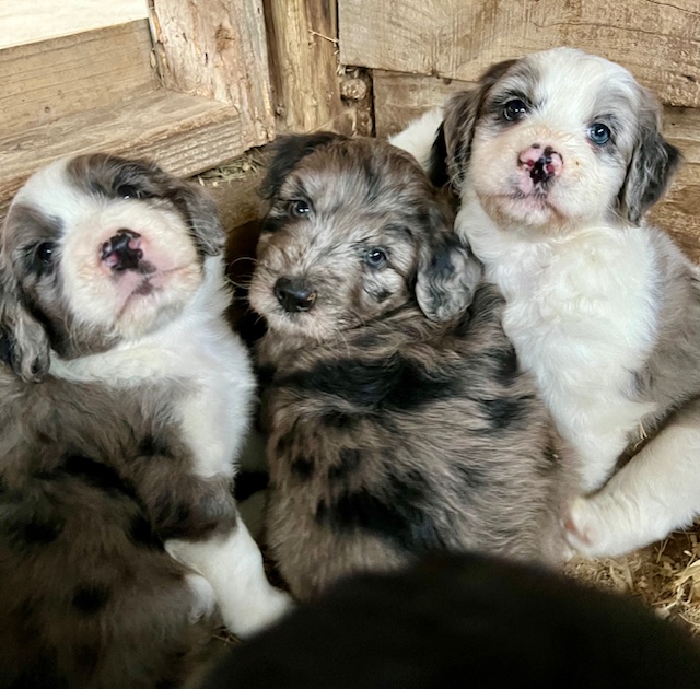 Green Acres Aussiedoodles is thrilled to announce our second litter of puppies. Our blue merle Australian Shepherd, Opal, and our Standard Poodle, Jack, had a beautiful litter of blue merle Aussiedoodles on January 12, 2023. There are five puppies available for adoption. Each puppy has its own unique markings and personality, but all of them are healthy, spunky, and available for adoption at 8 weeks old on March 9, 2023. They will come with their first round of shots, three rounds of deworming, and a complete vet check from our local veterinarian. The puppies will be $1,750 each and will require a $500 deposit to save your puppy of choice with the balance due on the date they go home with your family. You can contact us via Facebook Messenger or at the email address provided on our home page. **The most recent pictures are at the top!**