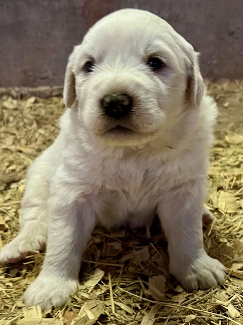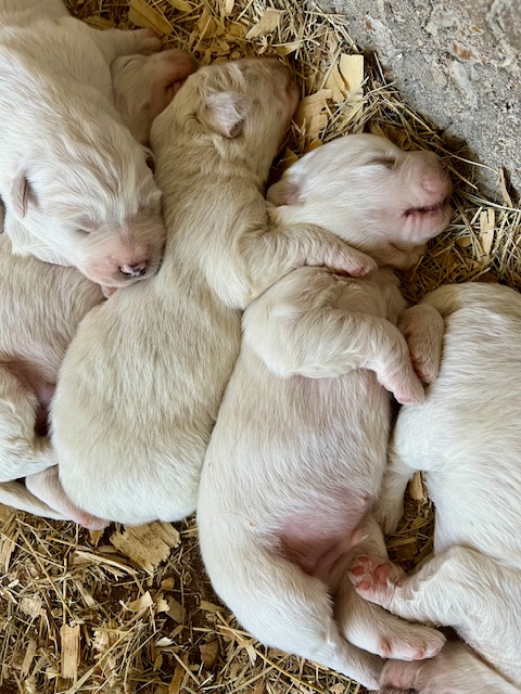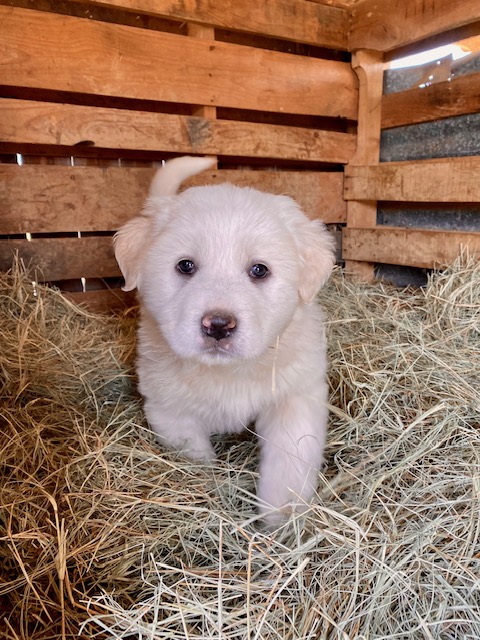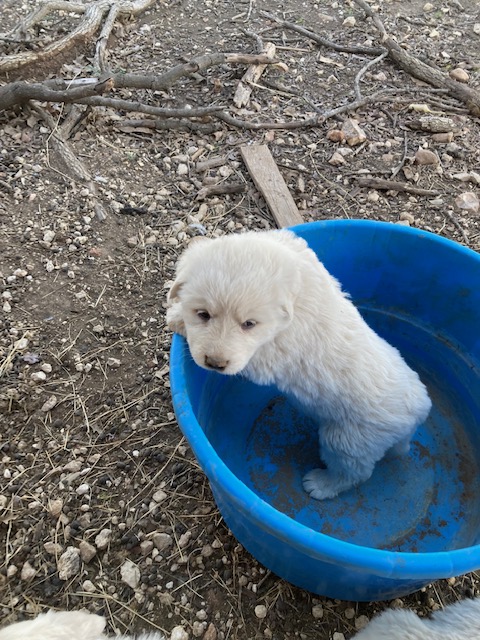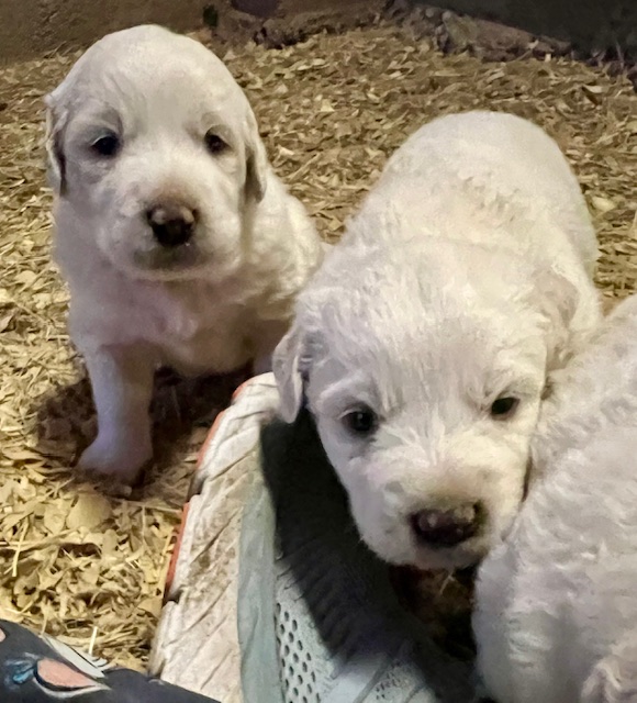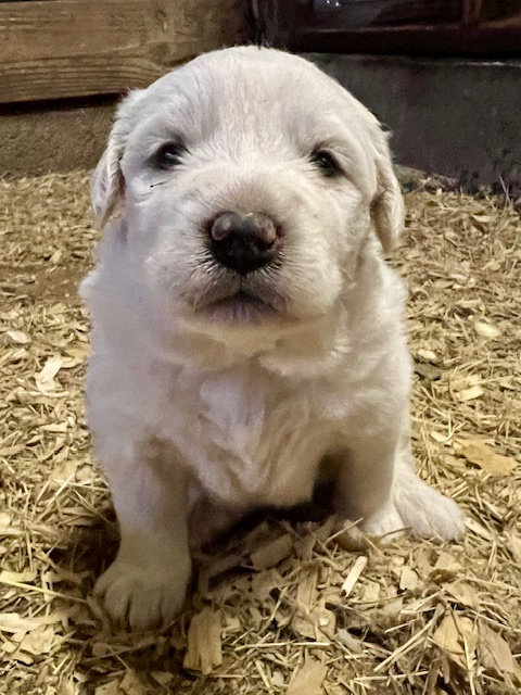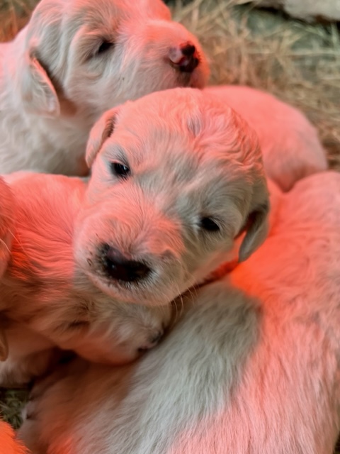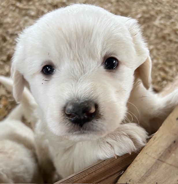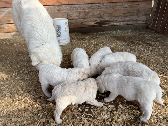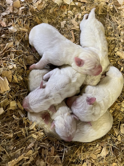 Updated 02/27/24: We were trying to wait until the puppies were two weeks and had their eyes open to do another update, but we know that many of you are super excited to see your puppies so I will post this update for you! 🙂 Their little noses and ears and the lining of their mouth and eyes are starting to turn black like their Great Pyrenees momma and it is so cute! They are all super chunky and fluffy.