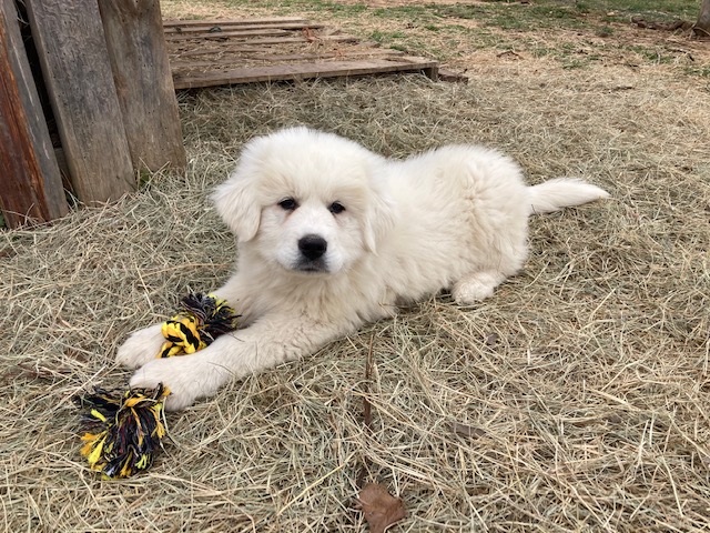 Because Great Pyrenees shed their thick coats several times per year, we decided to cross breed them with our Standard Poodle, Jack, to breed a hybrid dog known as Pyredoodles. **Please see our page called Green Acres Aussiedoodles to see information about our male Standard Poodle, Jack, and his parents.** With the addition of the non-shedding poodle hair, we are hoping to see a reduction in shedding and allergens produced. Please note that their coats will, most likely, need to be groomed regularly in order to prevent tangles and knots in their thick coats.
