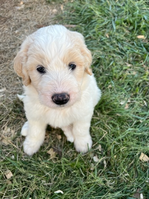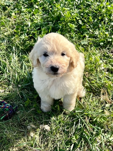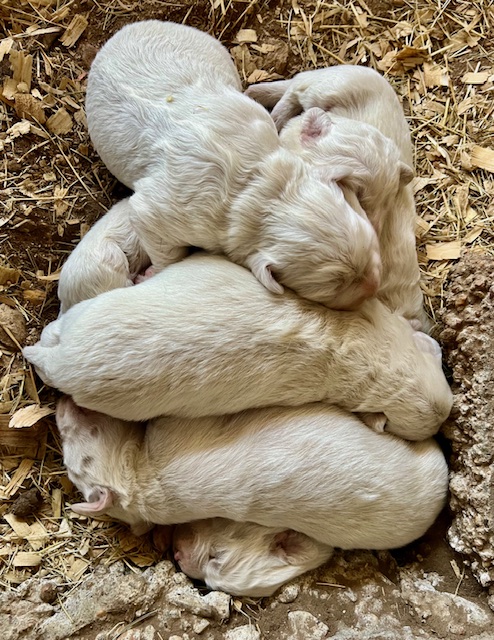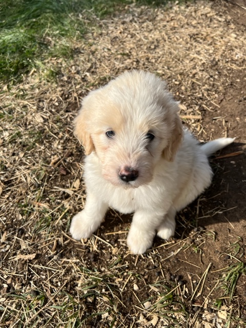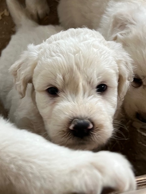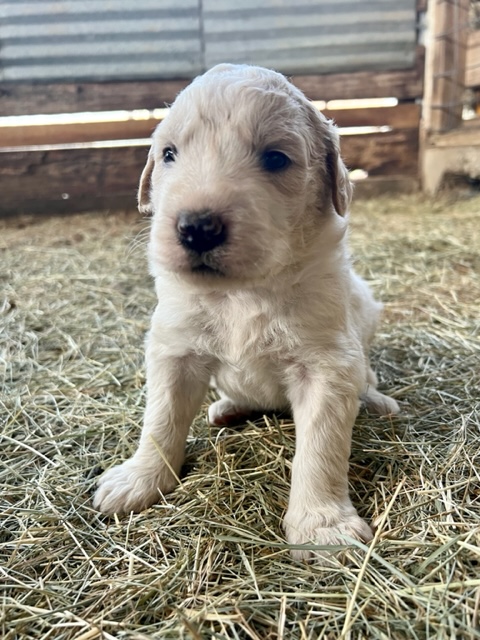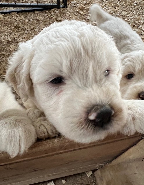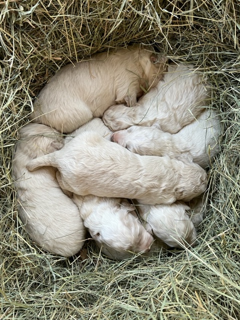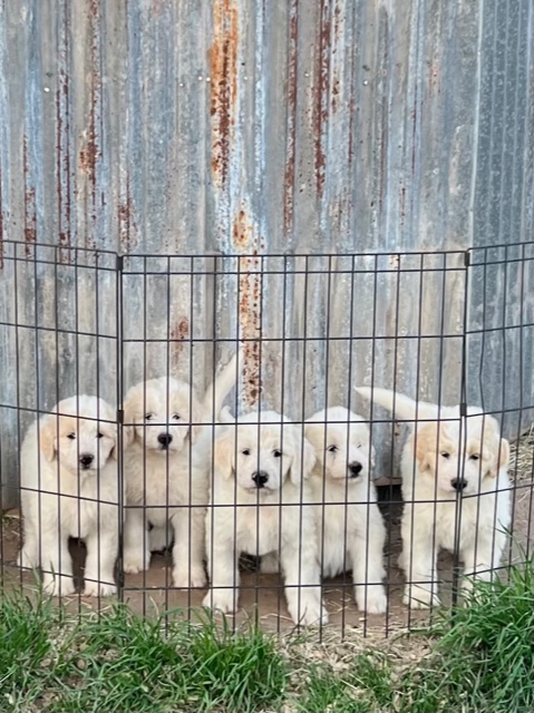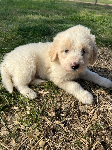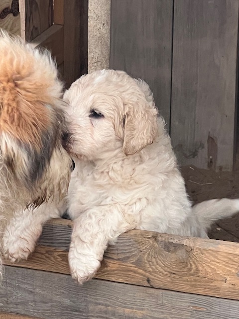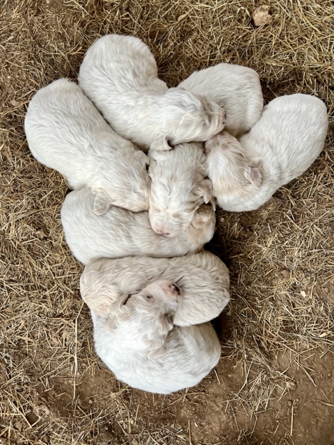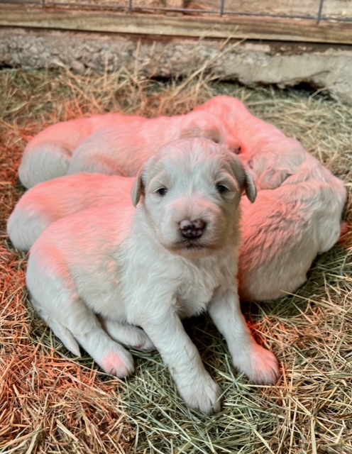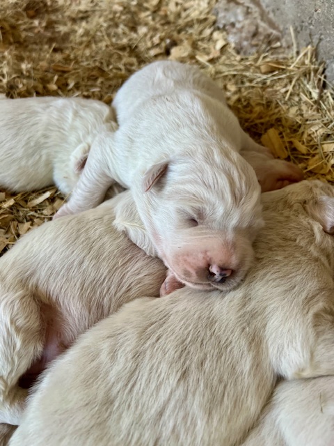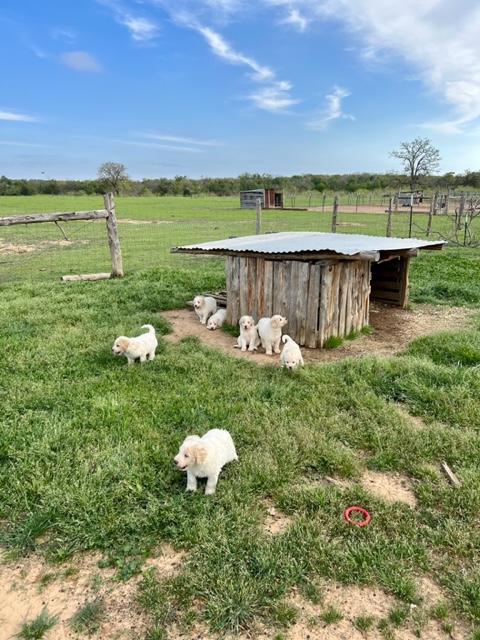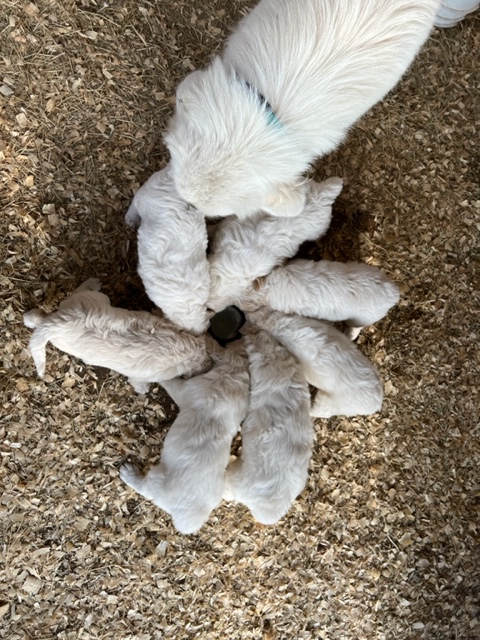 In true Frozen fashion, Anna delivered her first litter of Pyredoodles on January 28, 2023 which was the first day of the Ice-pocolypse that downed power lines and huge trees across Central Texas and knocked out electricity for days!! Each one of her Pyredoodle puppies is different. Some of them have more of the Great Pyrenees genetics and others have more of the poodle genetics. The thing I love the most about our first litter of Pyredoodles is that, instead of having 7 solid white puppies who look identical, each one of our 7 puppies has unique markings. The markings they are exhibiting are common and acceptable in the Great Pyrenees breed standards. We have some with blonde ears, some with light brown markings, some with one darker ear, some with tan stripes on their heads, and one that is solid cream like her dad, Jack. They all have thick, wavy hair that is absolutely beautiful and soft.