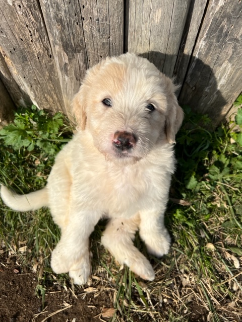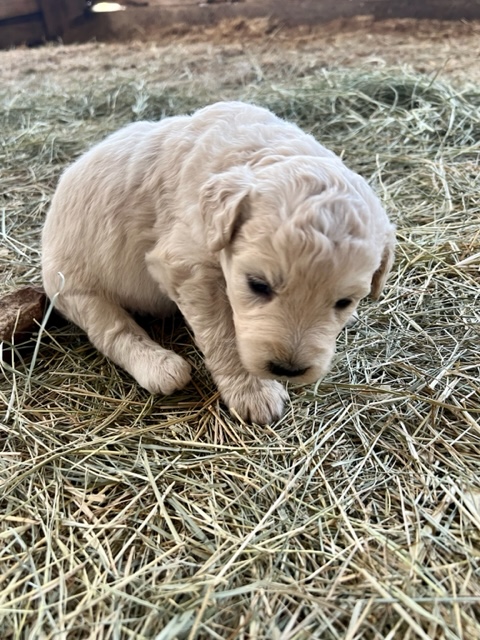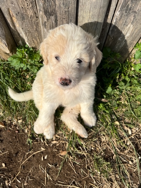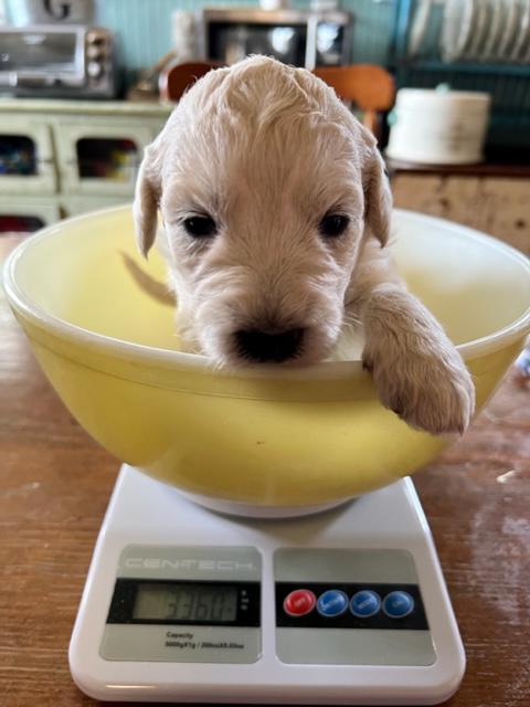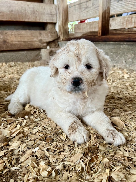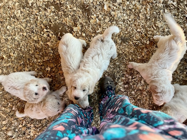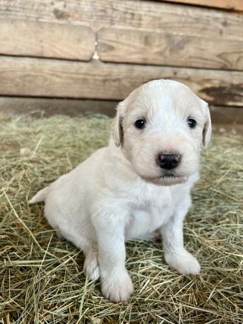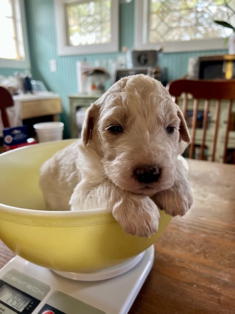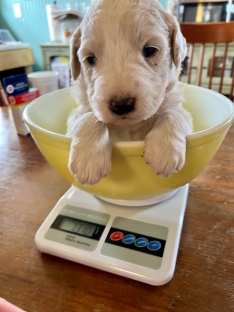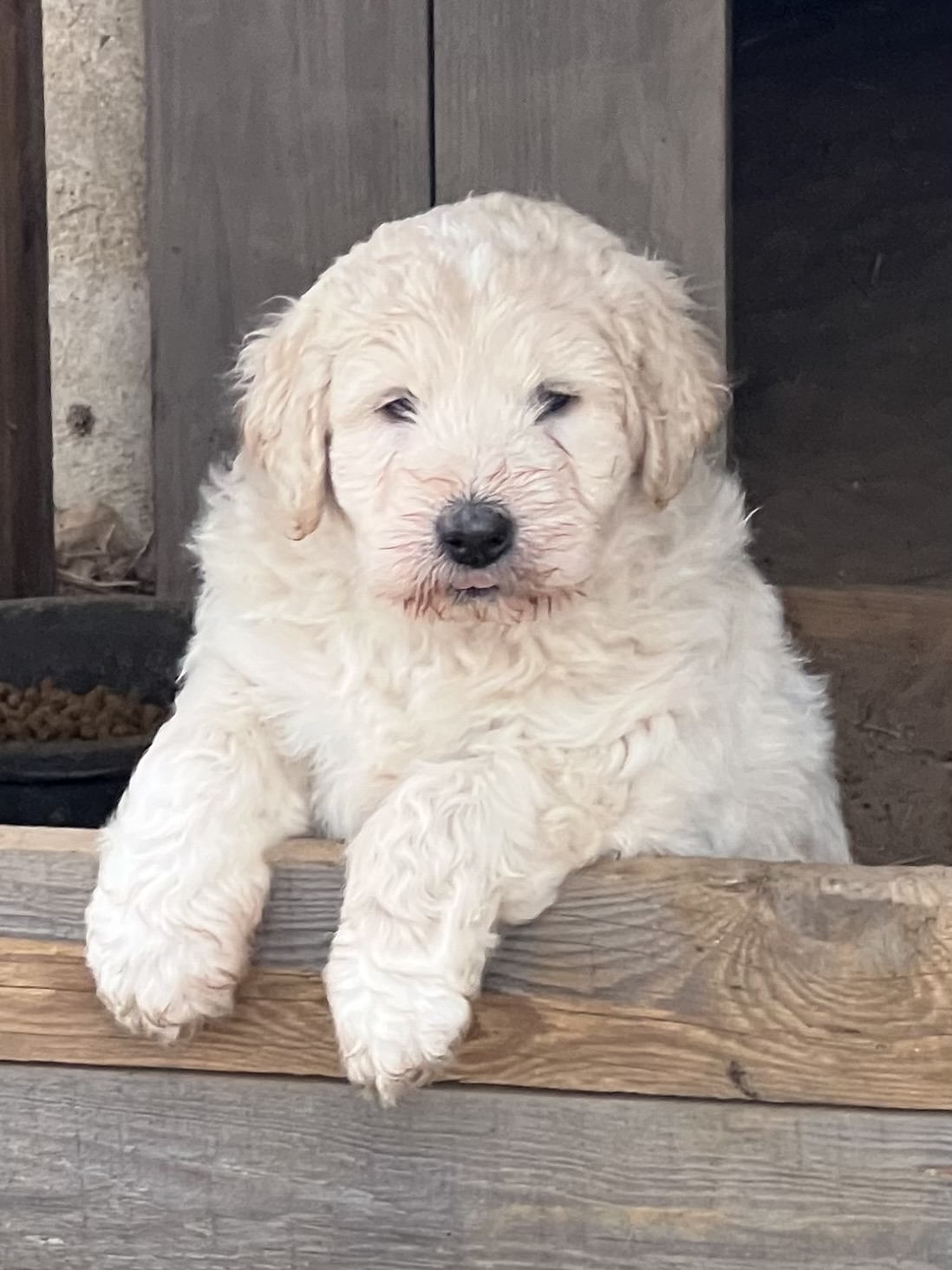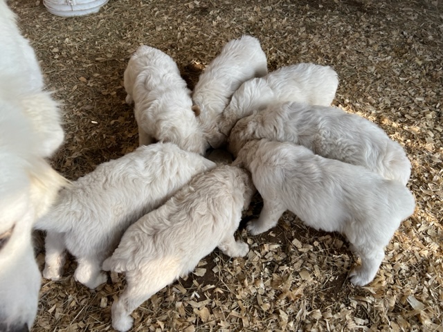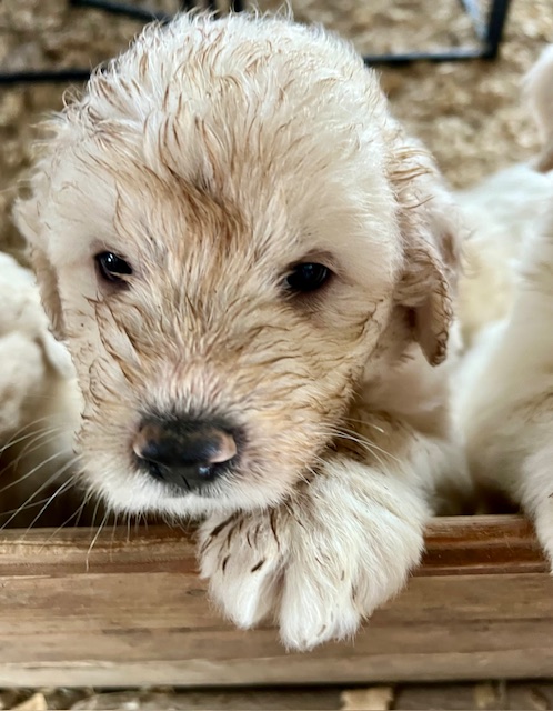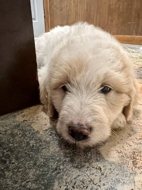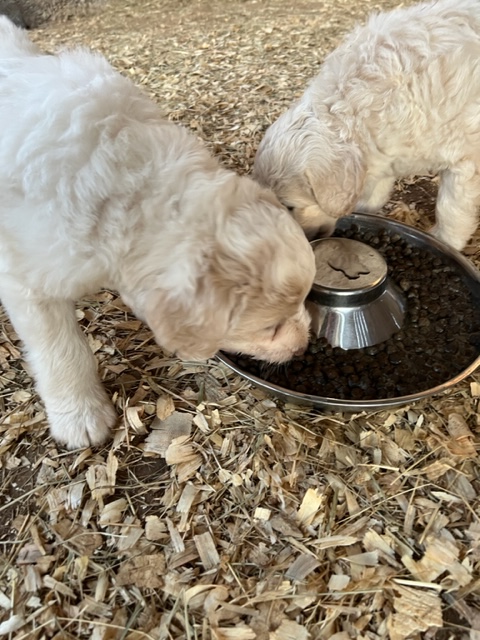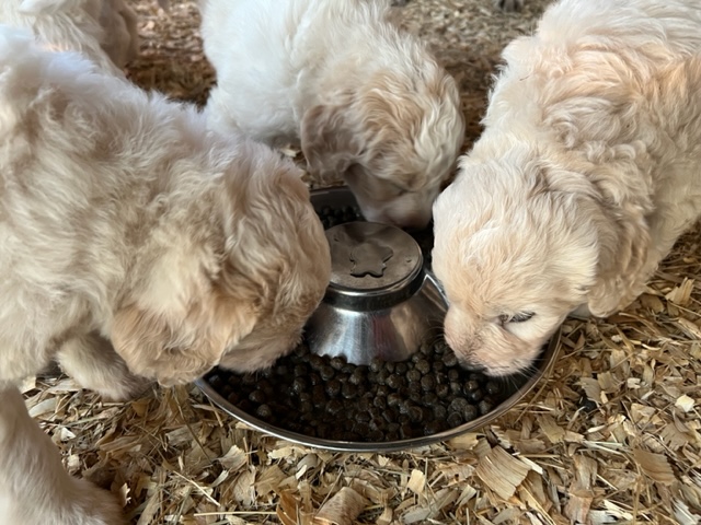 03/28/24!! Here are some much anticipated new pictures from the last two weeks!! We have been so busy at the farm that it has been difficult to find time to post pictures!! Sorry to all of my Pyredoodle customers!! 🙂 I wanted to post some pictures (the first 5 pictures!) that show “the struggle is real” to get good pictures once they are introduced to solid foods!! That is one of the main reasons I haven’t been able to get good, updated pictures!! They are usually covered with food! Haha!! It is getting better now though, thank goodness!